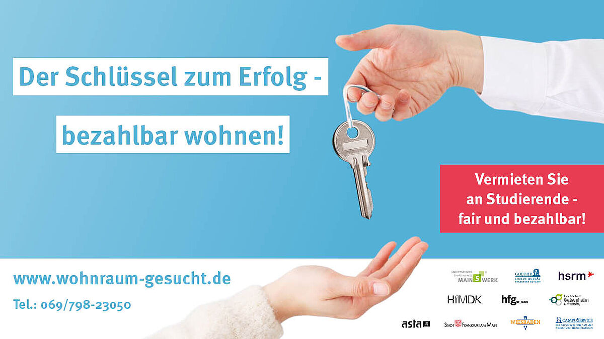 Vor diesem Hintergrund geht unsere Wohnraumkampagne auch in diesem Jahr mit einem neuen Slogan an den Start. Unter dem Motto „Der Schlüssel zum Erfolg – bezahlbar wohnen!“ rufen wir alle Bürgerinnen und Bürger im Rhein-Main-Gebiet dazu auf, privaten Wohnraum an Studierende zu vermieten – fair und zu bezahlbaren Konditionen. Die Größe des Wohnraums, die zeitliche Verfügbarkeit und die räumliche Nähe sind zweitrangig. Ein Zimmer für die ersten Wochen oder Monate am neuen Standort würde den Einstieg in einen neuen Lebensabschnitt erleichtern. Bei den wohnungssuchenden Studierenden, die gerade als Erstsemester am neuen Studienstandort starten wollen, sind alle Angebote willkommen.